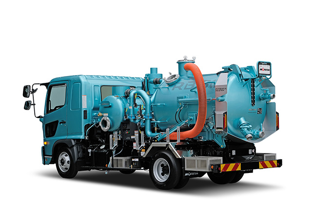 The high-power vacuum truck "Powerful Master™ RB150" can easily suck and transport sludge from the sewage and gutters or soil left in construction sites with low noise even from a long reach with its powerful suction force. The product uses a new design achieved both higher safety & work efficiency and lighter, smaller body structure