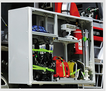 車両の周りで作業する人にとってもハッチが邪魔になるということはありません。また、側面のドア内部には、電動油圧式昇降棚を備え、資機材を取り出しやすい位置まで降ろすことが可能です。
