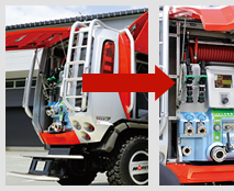 また、消火装置は、林野火災では水源の確保が困難となることも勘案し、当社が開発した少量の水で優れた消火能力を発揮するCAFS(Compressed Air Foam System:圧縮空気泡消火装置)を搭載しています。