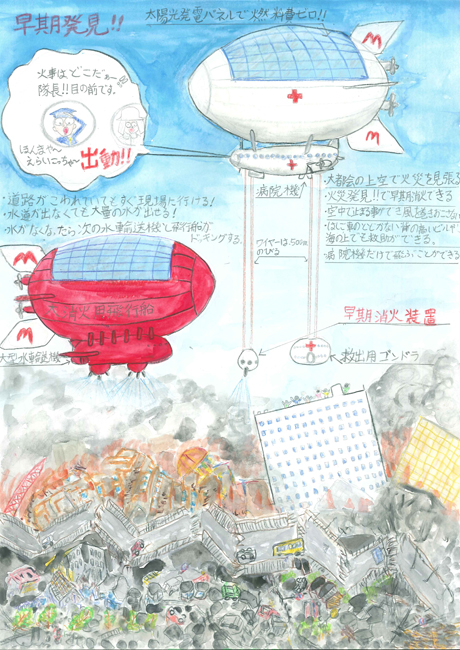 太陽光発電パネルで燃費ゼロなので大都会の上空で火災を見張ることができるし、早期発見で早期消火が出来る。はしご車の届かないところでも人命を救助できる飛行船なのでヘリコプターのように風を巻き起こさず大型水輸送機を空中に浮かせることができる。苦労したところ:大地震で大火災が起きているところを描いたところ。